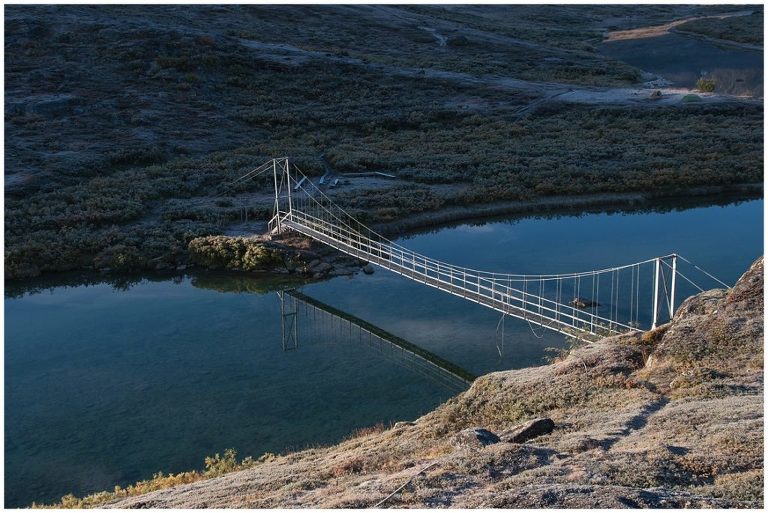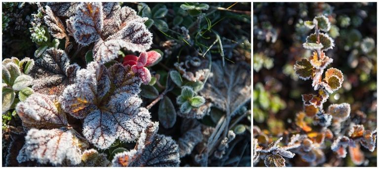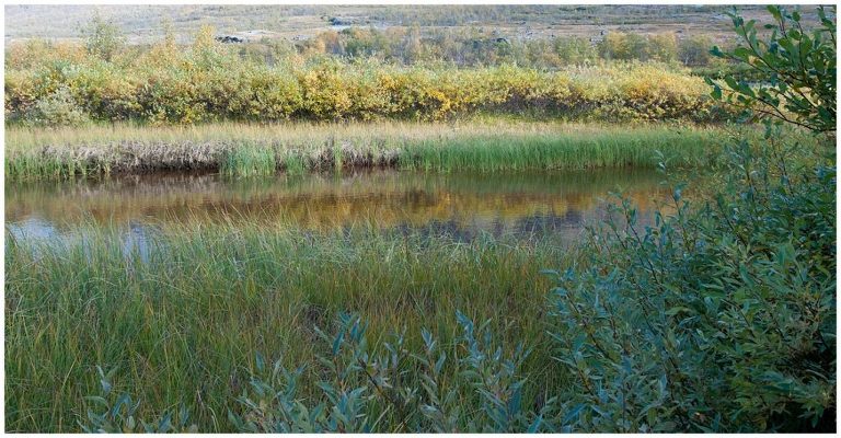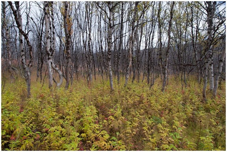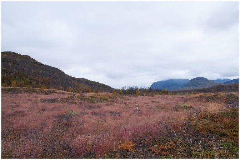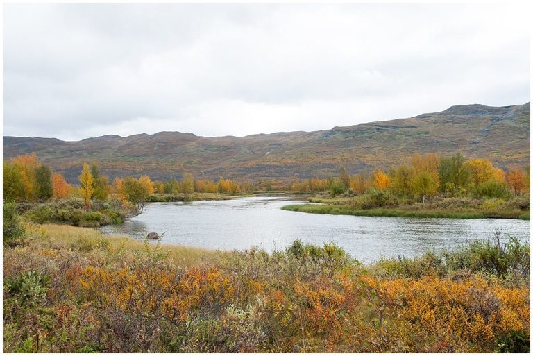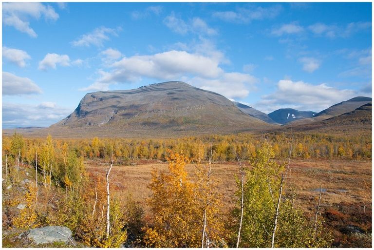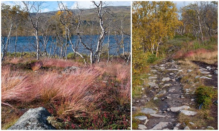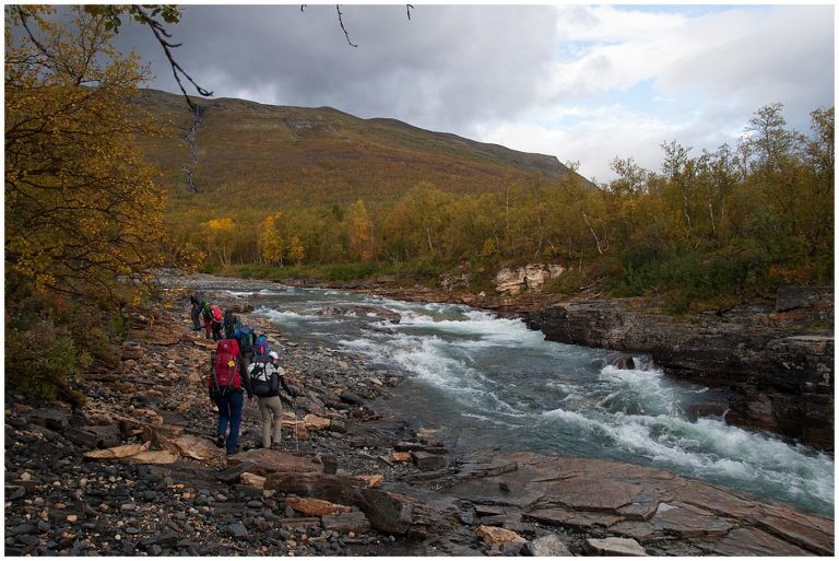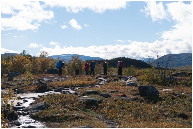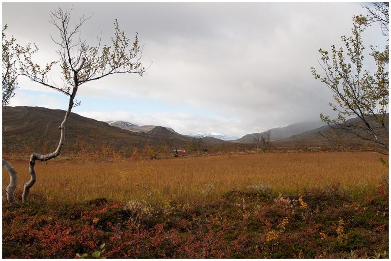 Am fünften Tag war die längste Tour für uns geplant, nämlich zurück nach Abiskojaure. Wir kamen wieder zur Baumgrenze und wanderten durch märchenhafte Birkenwälder und wir durchquerten zwei Bäche ohne oder bis übers Knie hochgekrempelte Wanderhosen, Barfuss in den Crocs, da es keine Brücken gab. Das war milde gesagt erfrischend (ungehobelt ausgedrückt wäre hier der Ausdruck „saukalt“ passend), aber dieses kleine Abenteuer regte die Durchblutung an, so dass wir nicht lange kalt hatten. Es war ein langer (ca. 24km) aber wunderschöner Tag!
