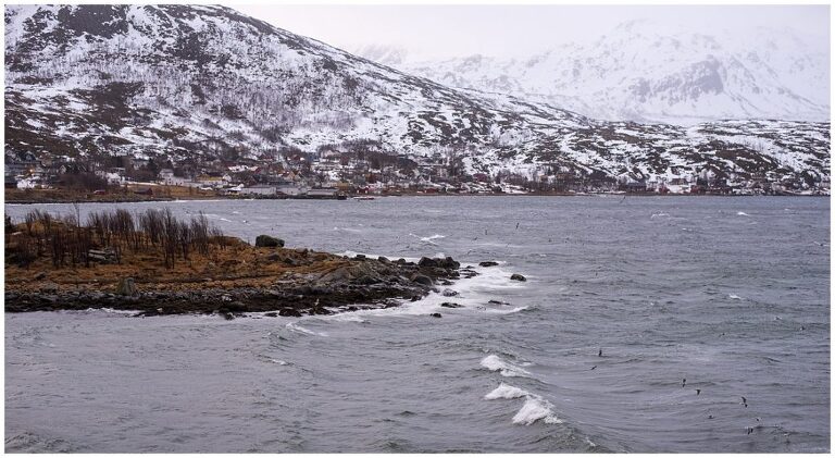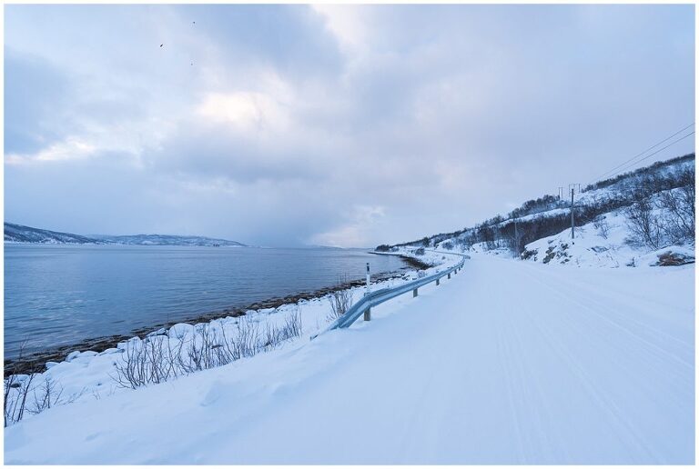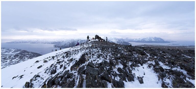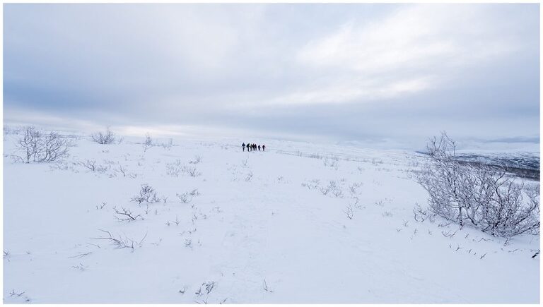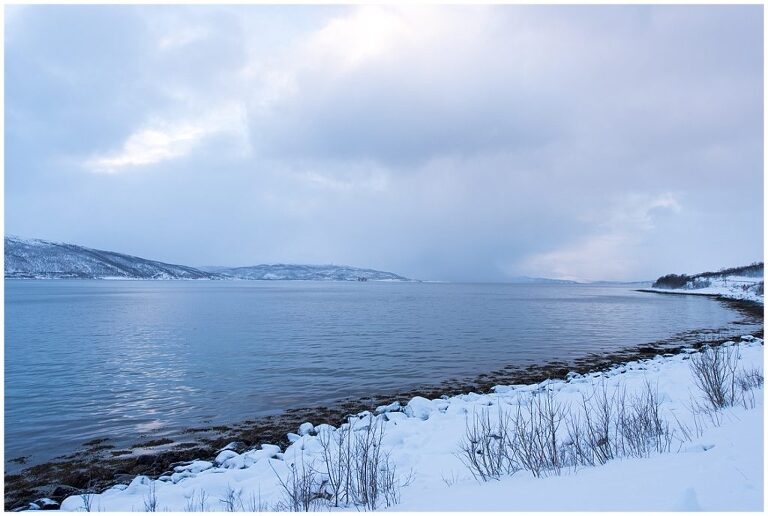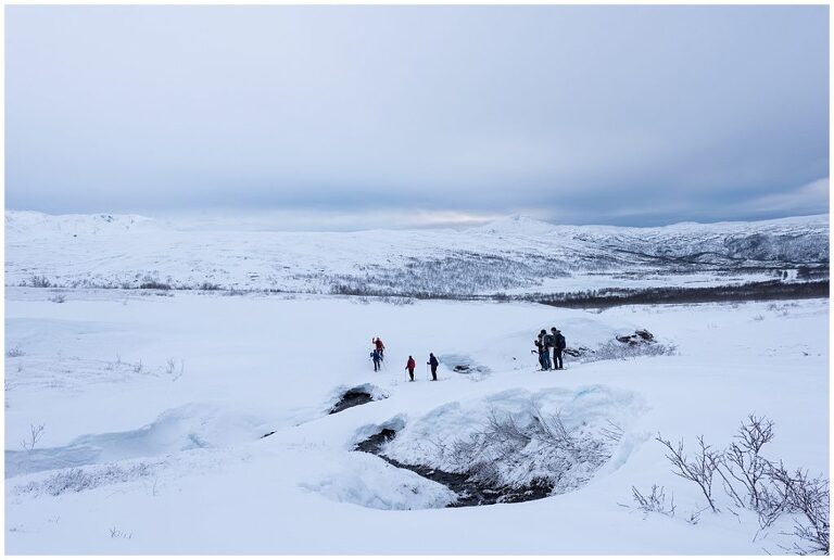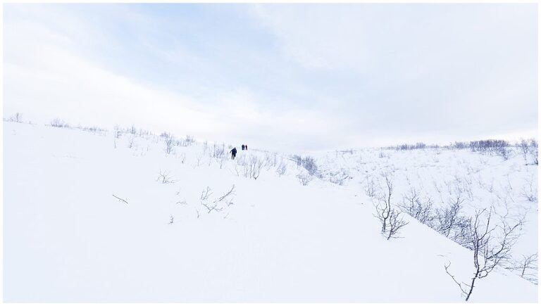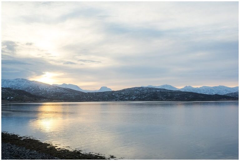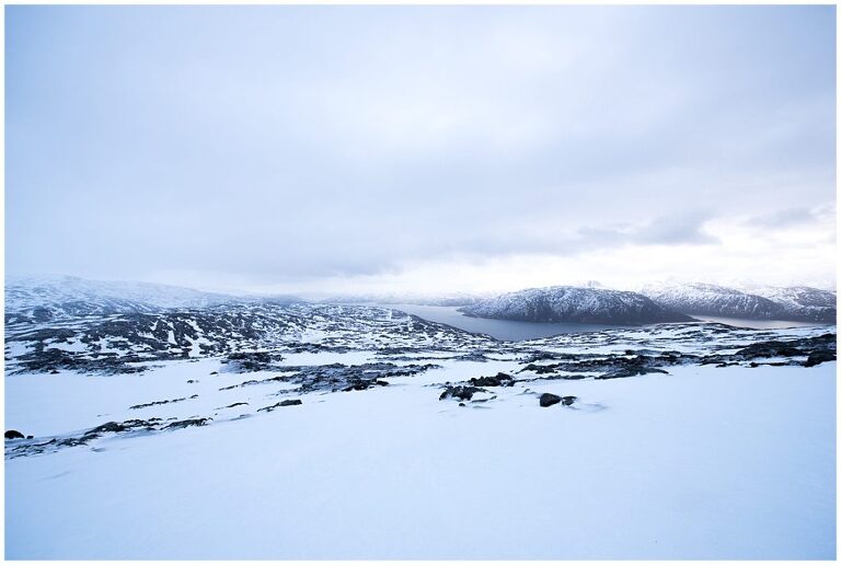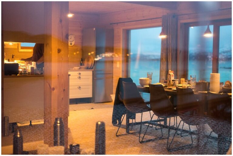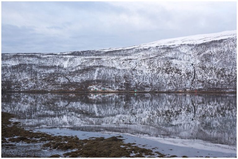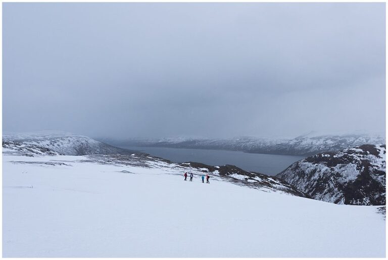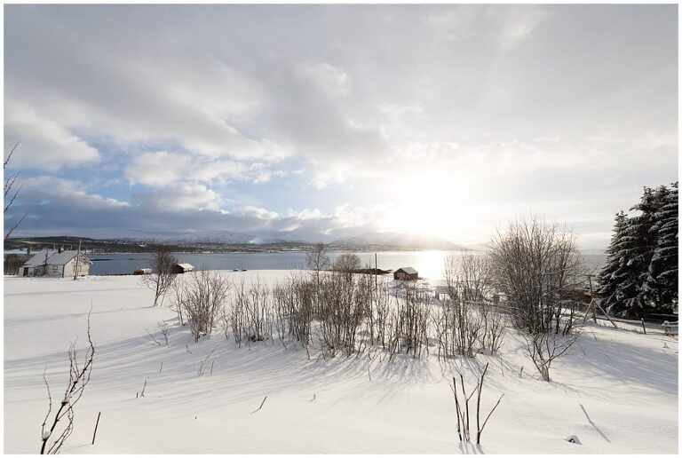 Gemeinsam mit den anderen Teilnehmern und dem Tourenleiter Cyril (er führte auch schon die Trekkingtour im Schwedischen Lappland) flogen wir weit hinauf in den Norden nach Tromsø. Bereits aus dem Flieger zeigte sich das Land unter einer weissen Schneedecke. Inseln, Fjorde, gefrorene Seen, Berge und dann Tromsø mit seinen markanten Brücken, die die Inseln verbinden. Bei Sonnenschein landeten wir auf Norwegischem Boden. Nach dem der Mietbus vollgeladen war fuhren wir zuerst zum Einkaufen und dann zur ersten Unterkunft in Ersfjordbodn, ein kleiner Ort auf der Insel Kvaløya. Es hatte nicht so viel Schnee wie erwartet, aber trotzdem war alles weiss bedeckt und sah wunderschön aus.