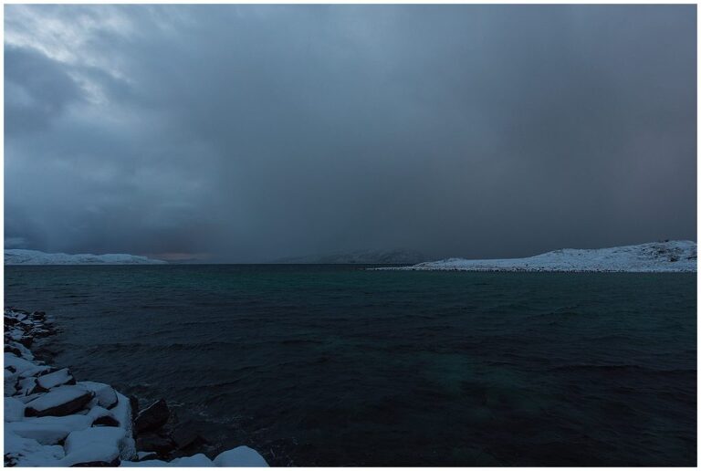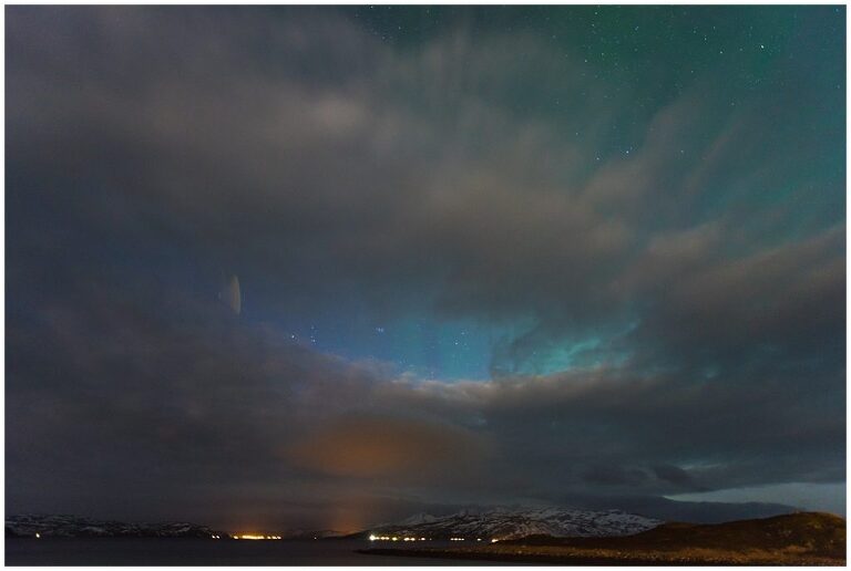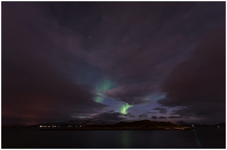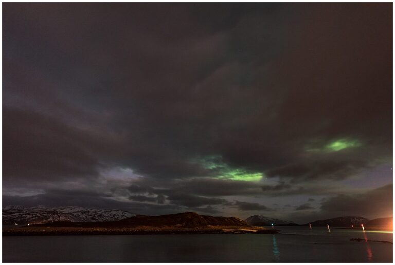 Die Sonne geht schon früh unter, so dass es bereits dunkel wurde als wir einen Rundgang durch den kleinen Ort machten. Garnicht so schlecht wenn es so früh dunkel wird, so kann man noch vor dem Abendessen das Stativ aufstellen und sich in Nachtfotografie üben und zu zweit macht es auch mehr Spass. Das Wetter schlug um und Wolken zogen über den Fjord ins Land hinein und formten ein grosses Herz an den Himmel.