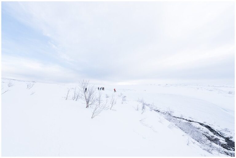 Es ging wieder durch den Birkenwald, der verschneit genau so schön ist wie im Herbstgewand. Wir liefen auf einer Ebene, so dass man sehr weit sah und es immer nur leicht anstieg. Das war die schönste Tour! Diese Weite und dan die Aussicht auf die Inseln und das Meer hinunter. Nach dem Mittagessen änderte sich das Wetter unglaublich schnell so das wir plötzlich im Nebel eingepackt waren. Dies führte vermutlich dazu das mir schwindlig wurde und ich Kopfschmerzen bekam, kurz eine Pause was trinken und warm halten und es ging mir wieder besser. Cyril führte uns sicher zurück zum Wald wo die Sicht wieder besser wurde. Es hatte inzwischen zu schneien begonnen, so dass innert kürzester Zeit eine schöne Tiefschneelandschaft entstand und es richtig schön zum laufen war. Schade, dass dies bereits die letzte Tour war!